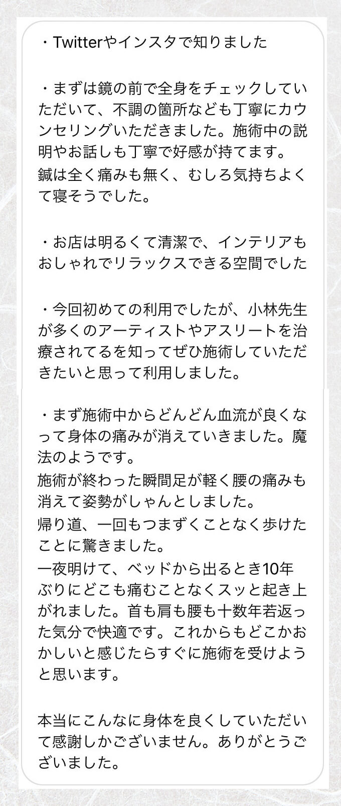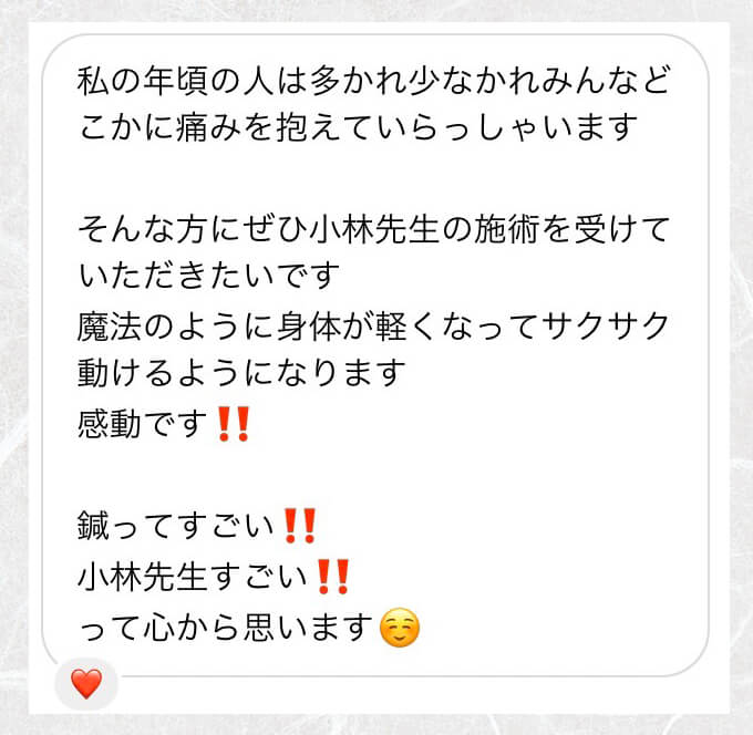 様々な症状で、病院などに行ったけど良くならなかったという方や、腰痛などの一般的なものから、逆子のお灸をしたい方、美容の悩みを持った方などにお越しいただいております。 - 生理中・妊娠中でも施術は受けることができますか?