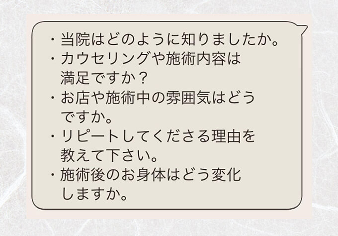 不安なこと、気になることなど、施術中でもお気軽にご相談ください。